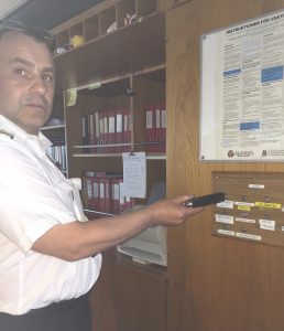 Väl tillbaka på kommandobryggan dockas ronderingsläsaren i en dockningsstation, som samtidigt laddar läsaren. Personal på bryggan kontrollerar att ronderingarna samstämmer med de noterade avstämningspunkterna.