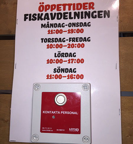 -”Butiken har två hjälpknappar, en vid fiskdisken och en vid bageriet. Vid vissa tider är det mindre kunder i affären och vi behöver då helt enkelt inte ha en personal som konstant står i fiskdisken och väntar på att få ge service. Vi måste fördela våra resurser effektivt och det innebär att personalen från fiskdisken även hjälper till med att packa upp varor i hyllorna på annat håll. Ibland måste de även kunna lämna disken för att inhämta varor för att förbereda inkomna beställningar av exempelvis smörgåstårtor.”, berättar Johan
